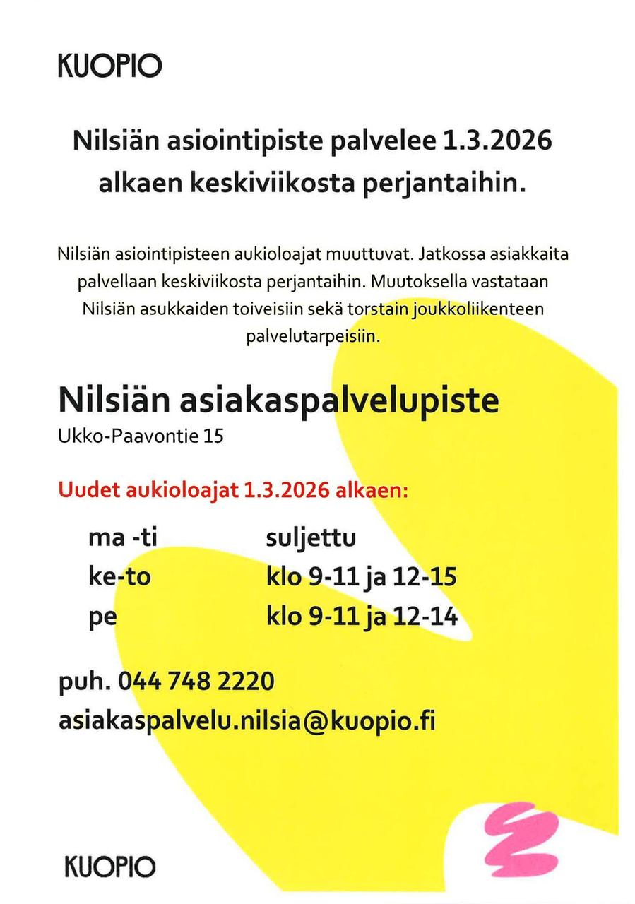 - Kuopion kaupungin Nilsiän asiakaspalvelupisteestä, Ukko-Paavontie 15, 0447482220