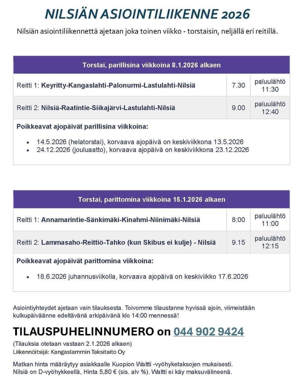 Nilsiän asiointiliikennettä ajetaan joka toinen viikko aina torstaisin neljällä eri reitillä. Asiointiyhteydet ajetaan vain tilauksesta. Toivomme tilaustanne hyvissä ajoin, viimeistään kulkupäiväänne edeltävänä arkipäivänä klo 14:00 mennessä!