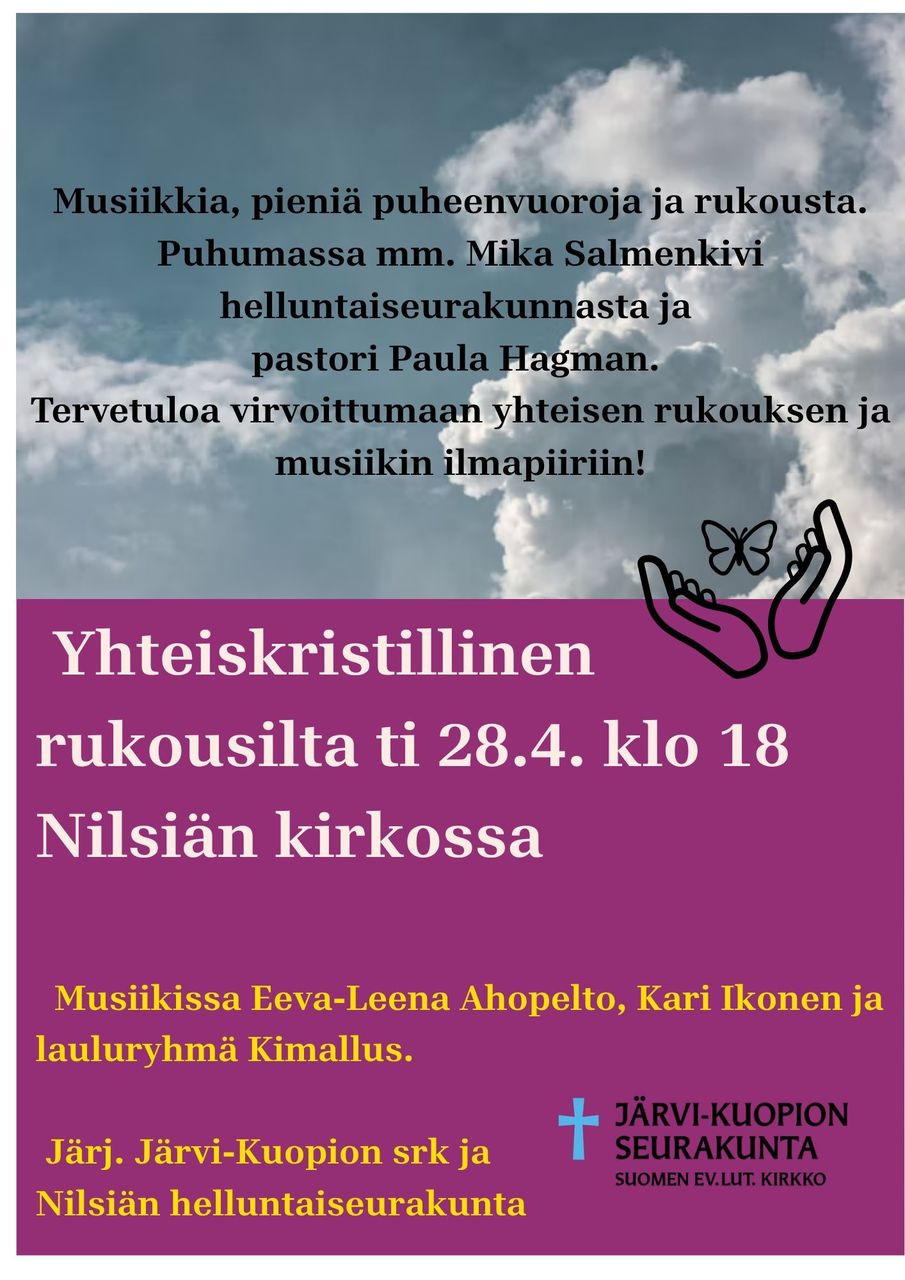Kaikki seurakunnan tapahtumien ajankohtaiset tiedot osoitteessa https://www.kuopionseurakunnat.fi/tapahtumat?q=nilsiä